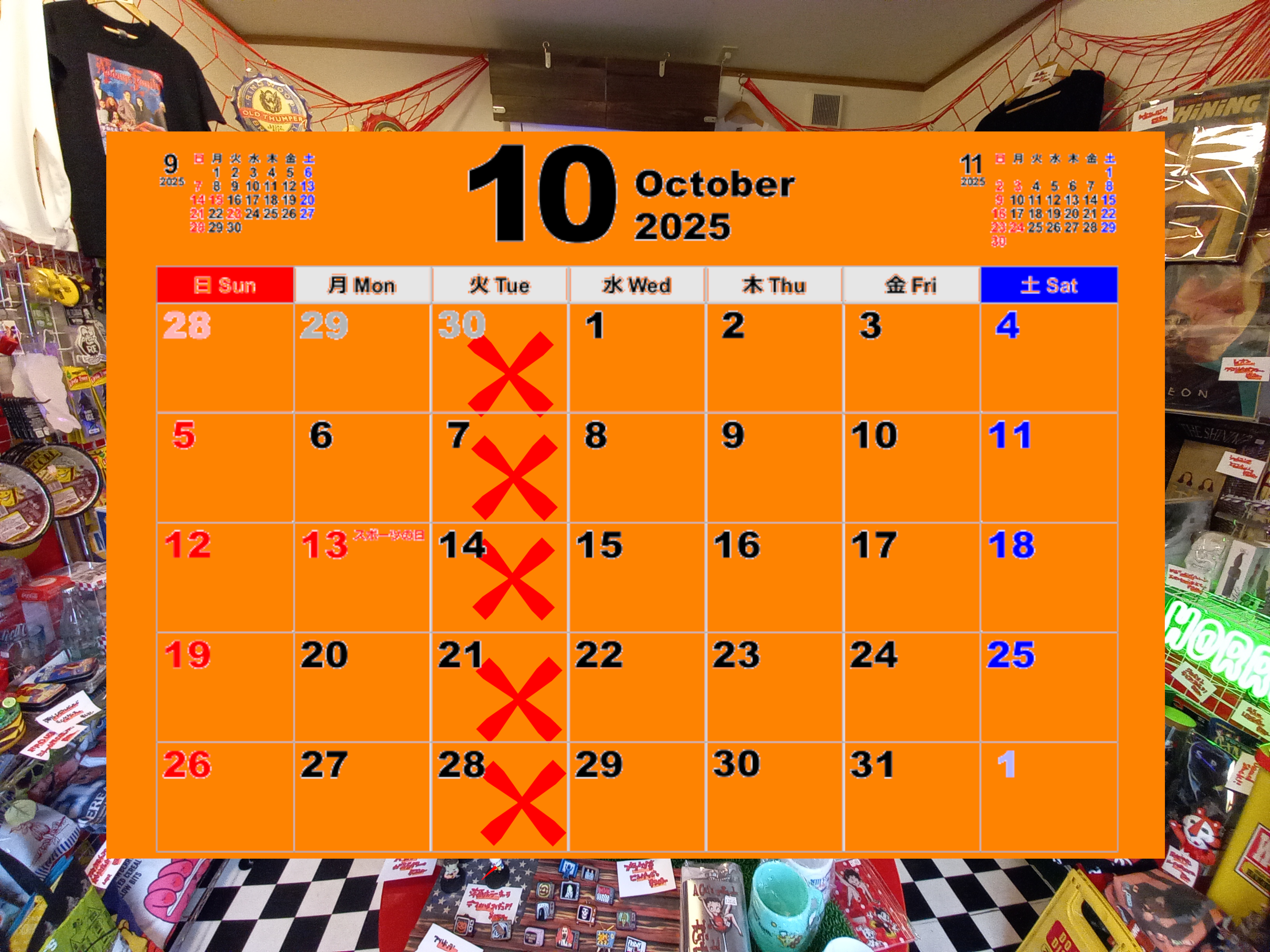 10月も基本火曜日が定休日となりますので、おいでになる際は曜日にお気を付けください。